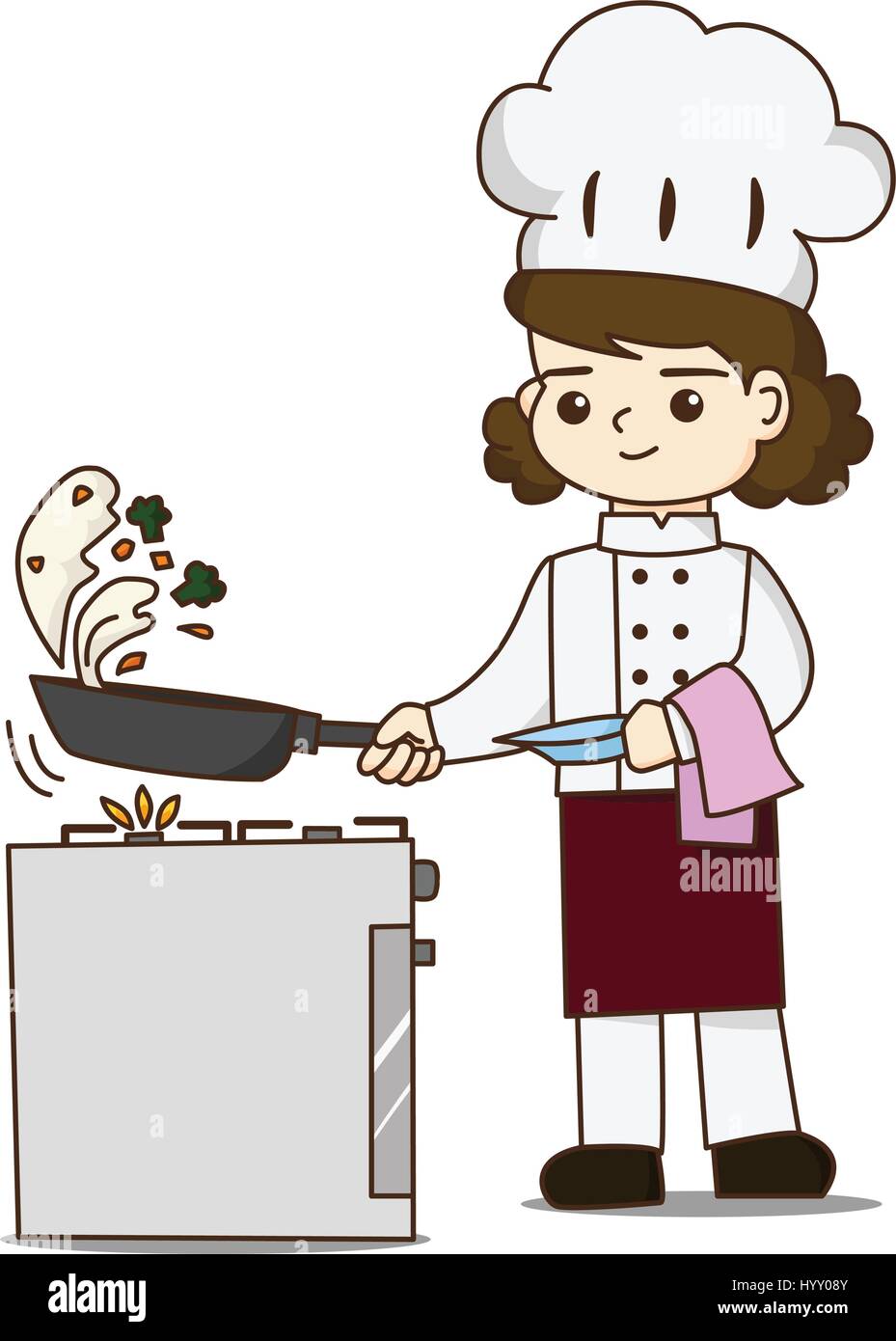 Joli chef making nourriture délicieuse, elle jeter la nourriture dans la poêle Image Vectorielle Stock - Alamy