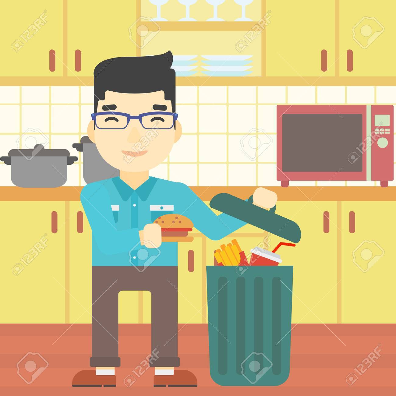 Un Homme Asiatique Mettre La Malbouffe Dans Une Poubelle. L'homme Refusant De Manger De La Malbouffe. Man Jeter De La Nourriture D'ordure Sur Le Fond De La Cuisine. Diet Concept. Vector Design