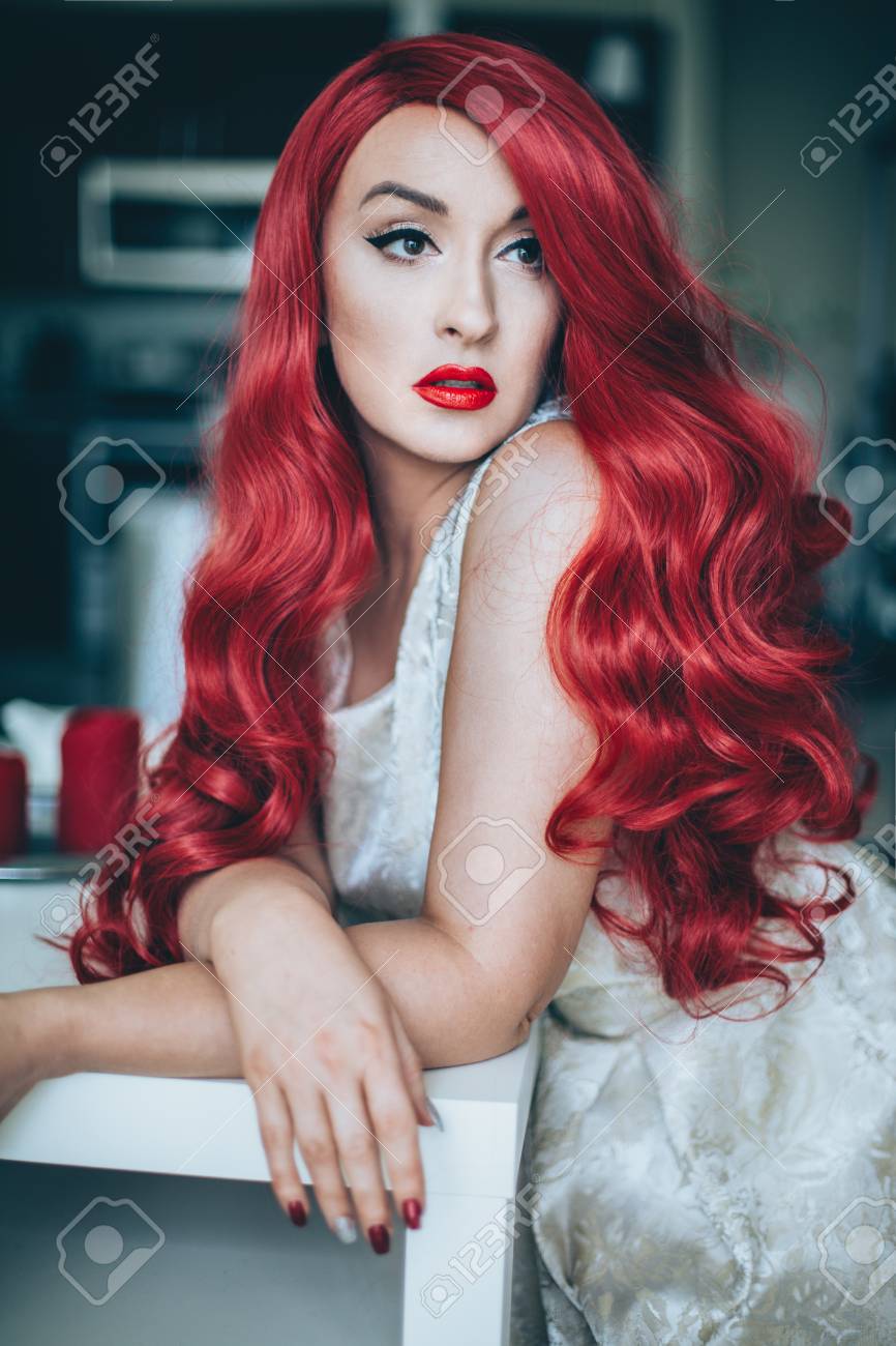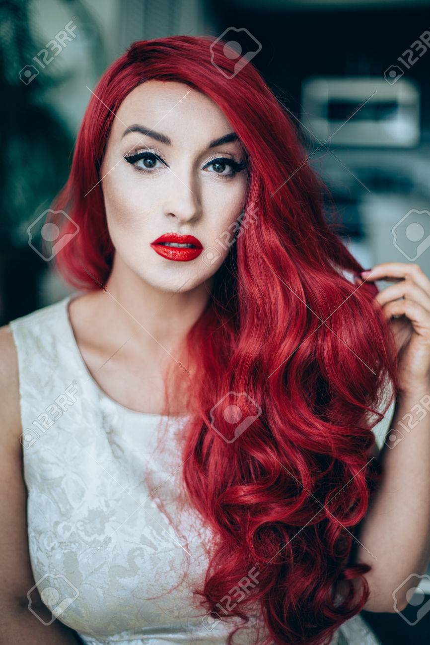 Fond Jeune Fille Aux Cheveux Rouges Dans Une Robe Rouge Vif Près ...
