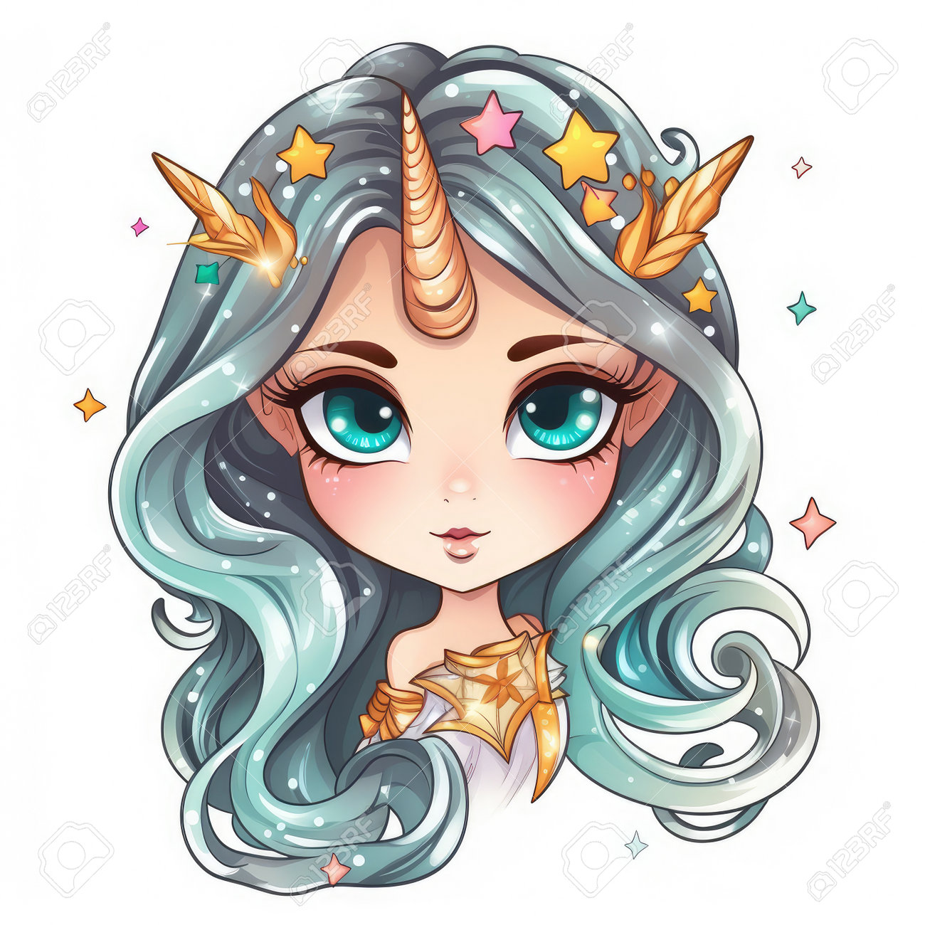 Jolie Fille De Licorne De Dessin Animé Avec Des Cheveux Longs Et Des Étoiles. Illustration Vectorielle. Banque D'Images et Photos Libres De Droits. Image 204367307