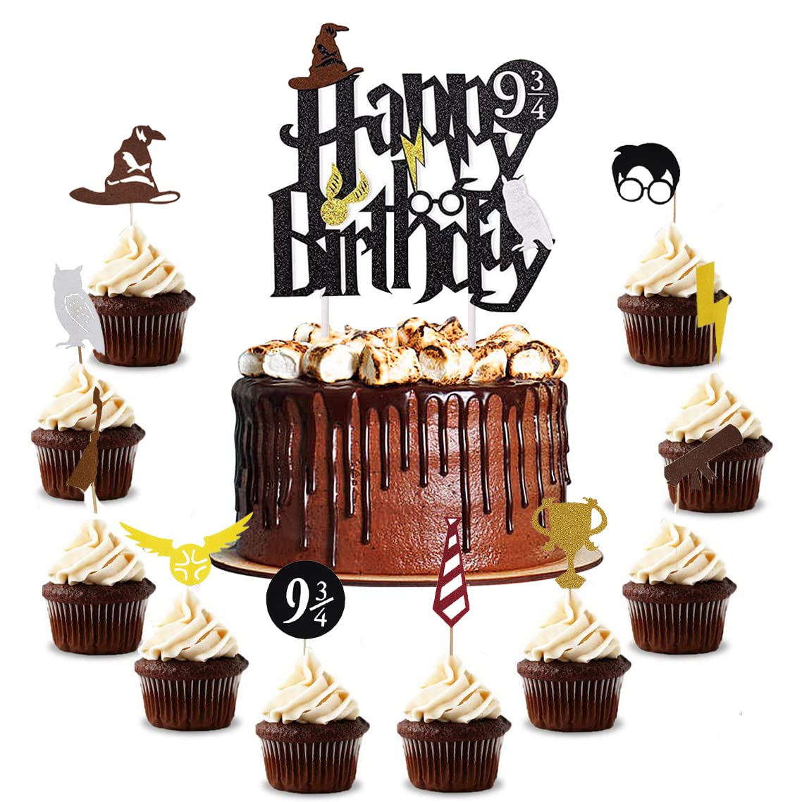 HCRXVV Magical Décoration de gâteau Black Wizard Happy Birthday pour garçon, décoration de gâteau à paillettes, décoration de cupcakes, joyeux ...