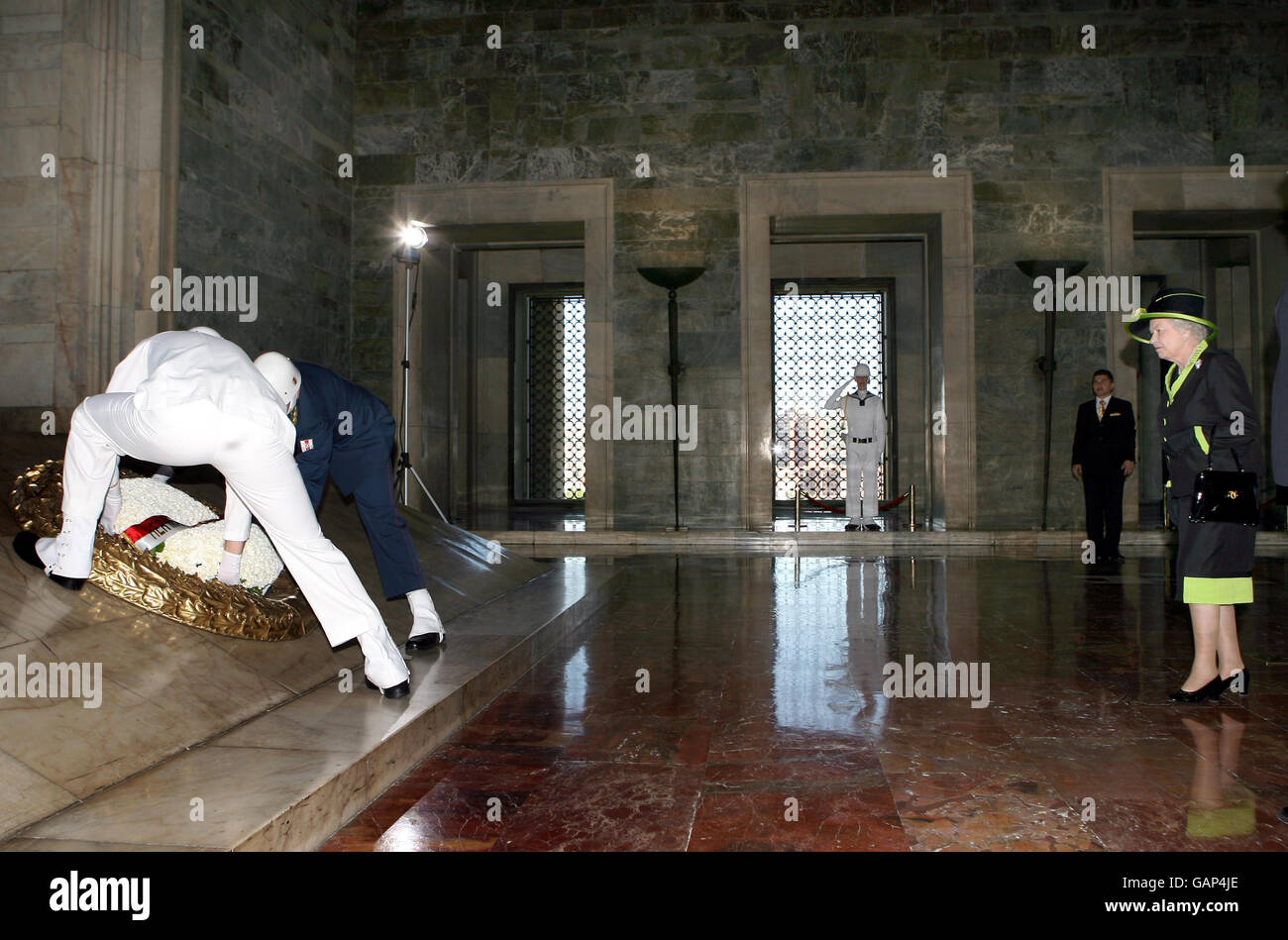 La reine Élisabeth II se penche au cours d'une cérémonie de pose de couronne dans le mausolée d'Anitkabir, pour le mémorial de Mustafa Kemal Ataturk, le premier président de la République de