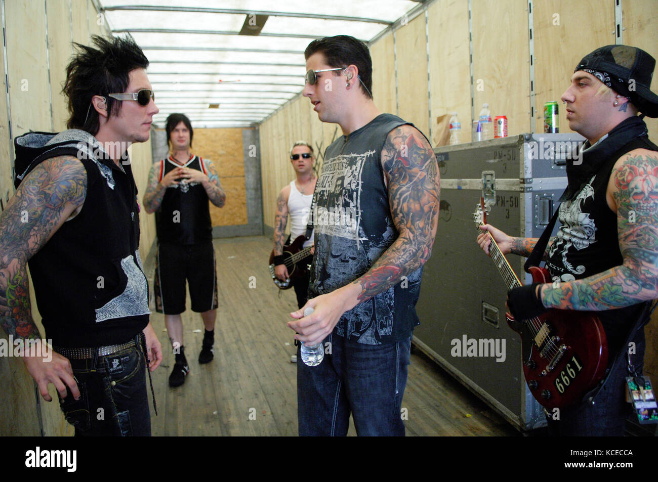 L-R) Synyster Gates, le Rev, Johnny Christ, M. Shadows, Zacky Vengeance de Avenged Sevenfold backstage au Vans Warped Tour 2007 au Home Depot Center de Carson, CA, pour le dernier jour de