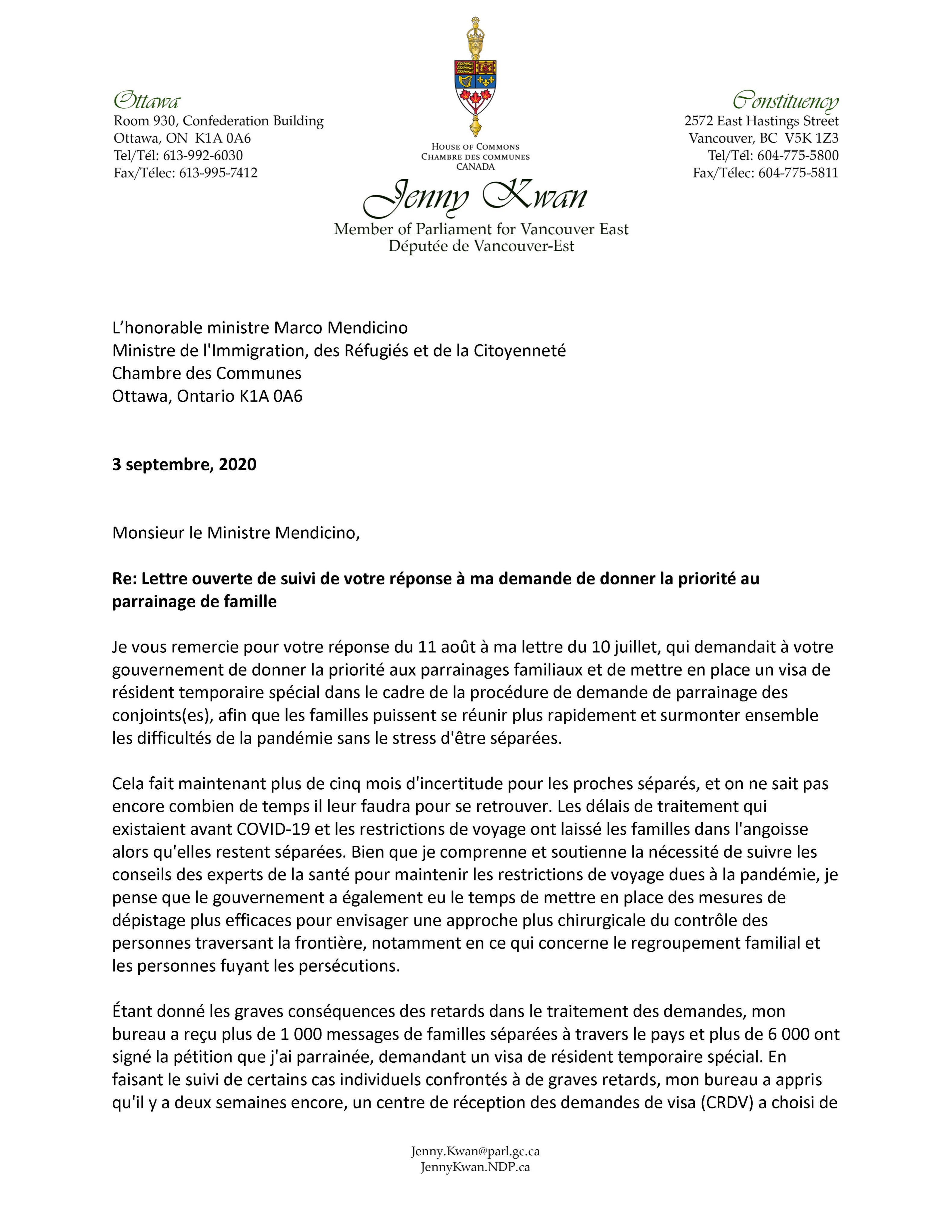 Jenny Kwan on X: "Ma lettre ouverte au ministre Mendicino, suite à sa réponse à mes appels à donner la priorité au regroupement familial et à créer un visa spécial de résident
