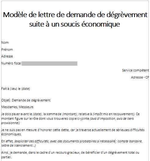 Modèle de lettre de dégrèvement suite à des difficultés économiques