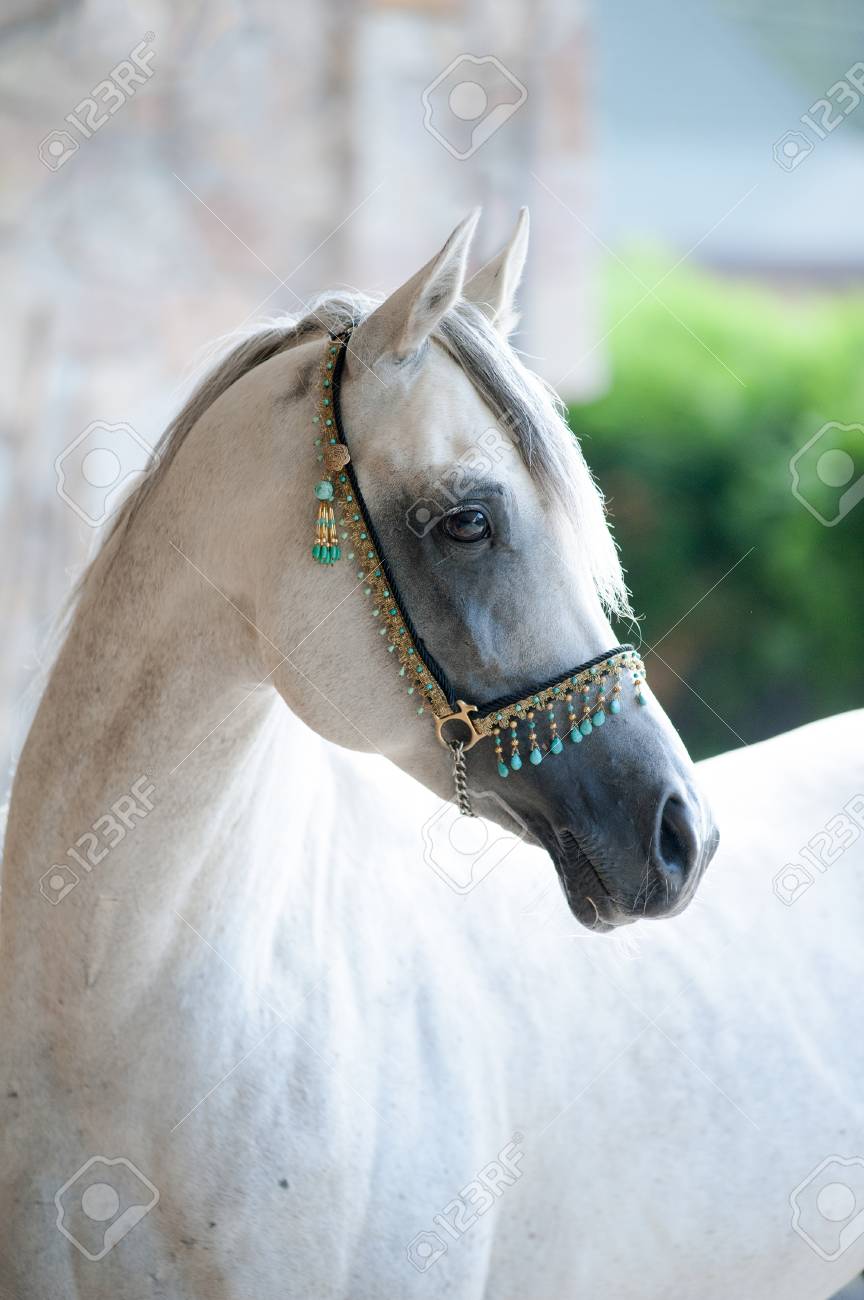 Photo libre de droit de Gris Cheval Arabe Avec Licol Décoratif ...