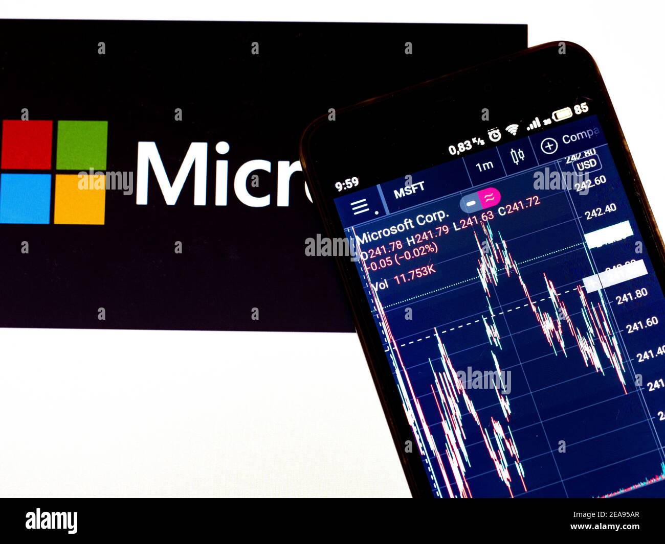 Ukraine. 8th Feb, 2021. In this photo illustration, Microsoft Corporation ( MSFT) Stock information seen displayed on a smartphone with a Microsoft Corp. logo in the background.The stock of Microsoft Corp. was last