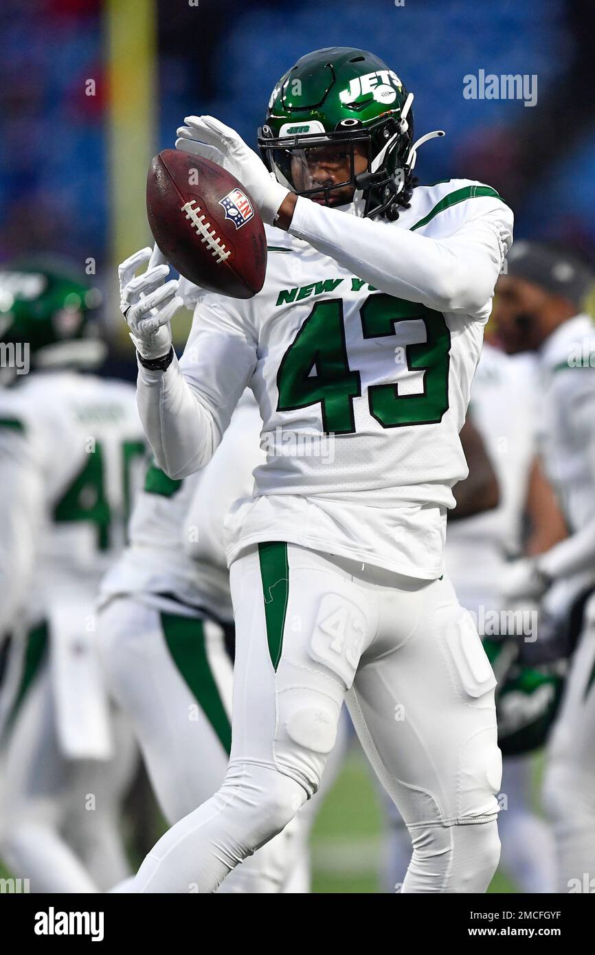 New York Jets' Del'Shawn Phillips warms-up before an NFL football game against the Buffalo Bills, Sunday, Jan. 9, 2022, in Orchard Park, N.Y. (AP Photo/Adrian Kraus Stock Photo - Alamy