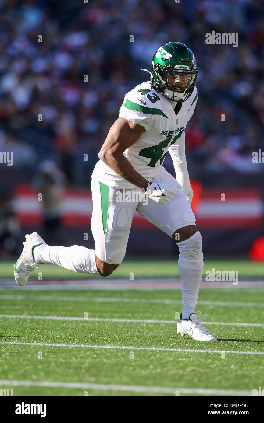 New York Jets linebacker Del'Shawn Phillips (43) defends during the second half of an NFL football game against the New England Patriots, Sunday, Oct. 24, 2021, in Foxborough, Mass. (AP Photo/Stew Milne