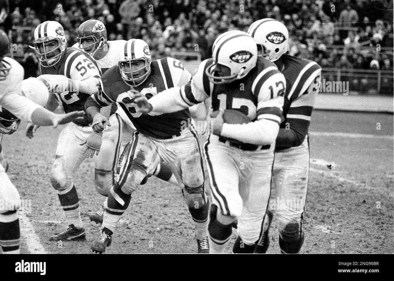 Jets quarterback Joe Namath finds himself in a tight spot in the New York - Kansas City American Football League in New York, Dec. 10, 1967 as he ends up with a