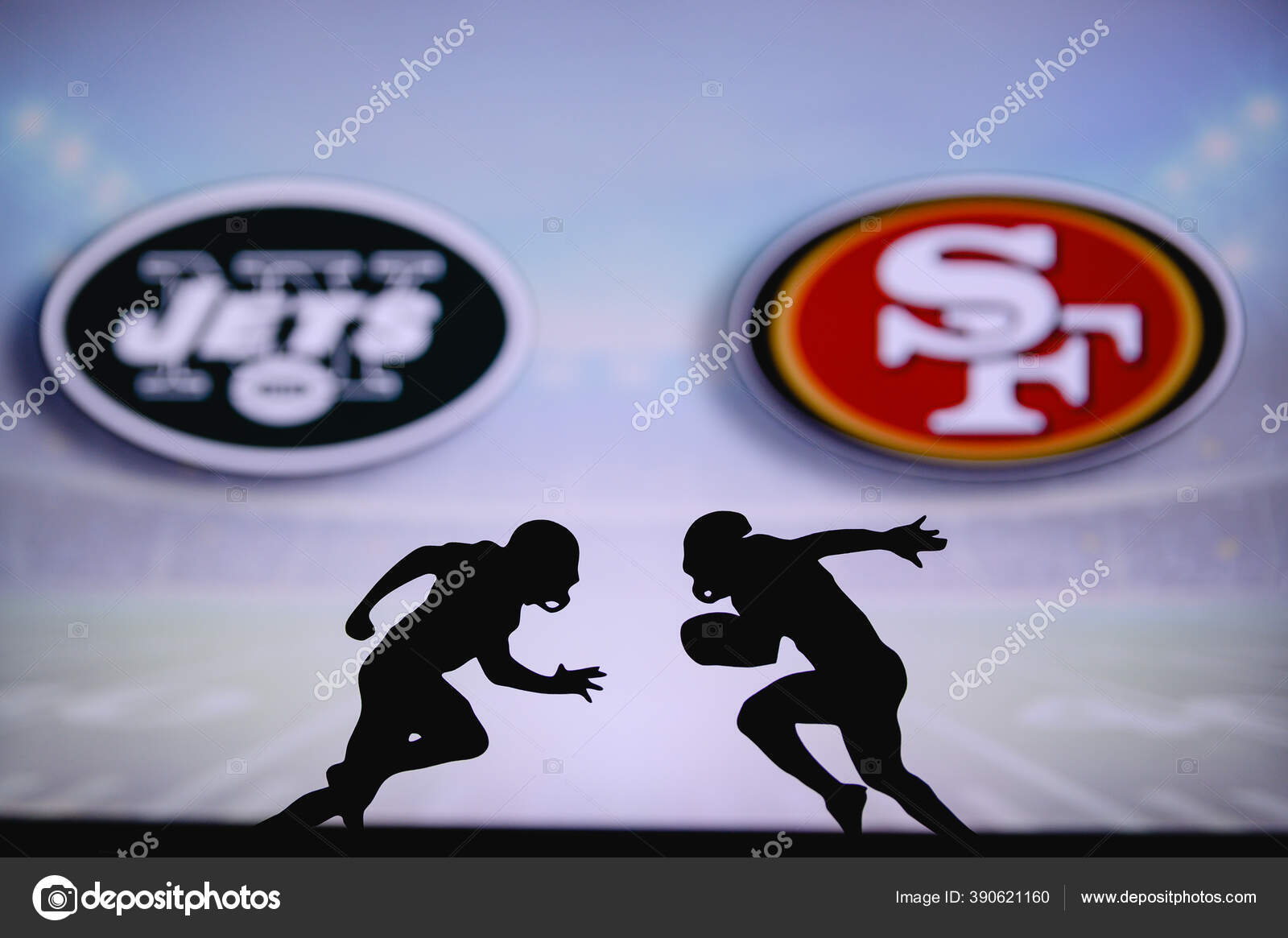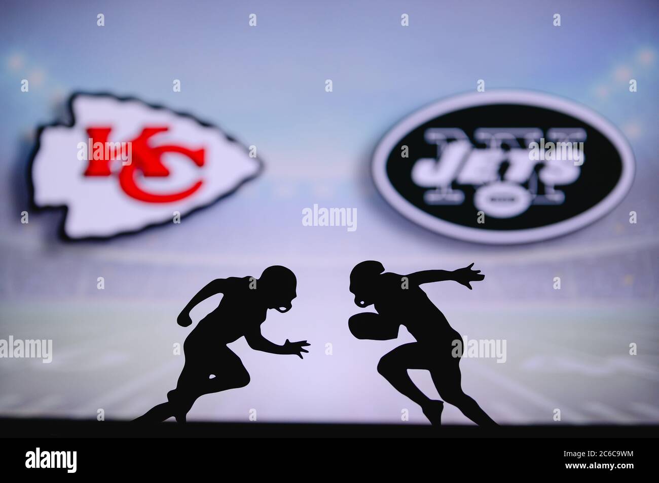 Kansas City Chiefs contre New York Jets. Affiche NFL Match. Deux joueurs de football américain se font face sur le terrain. Logo des clubs dans backgro Photo Stock - Alamy