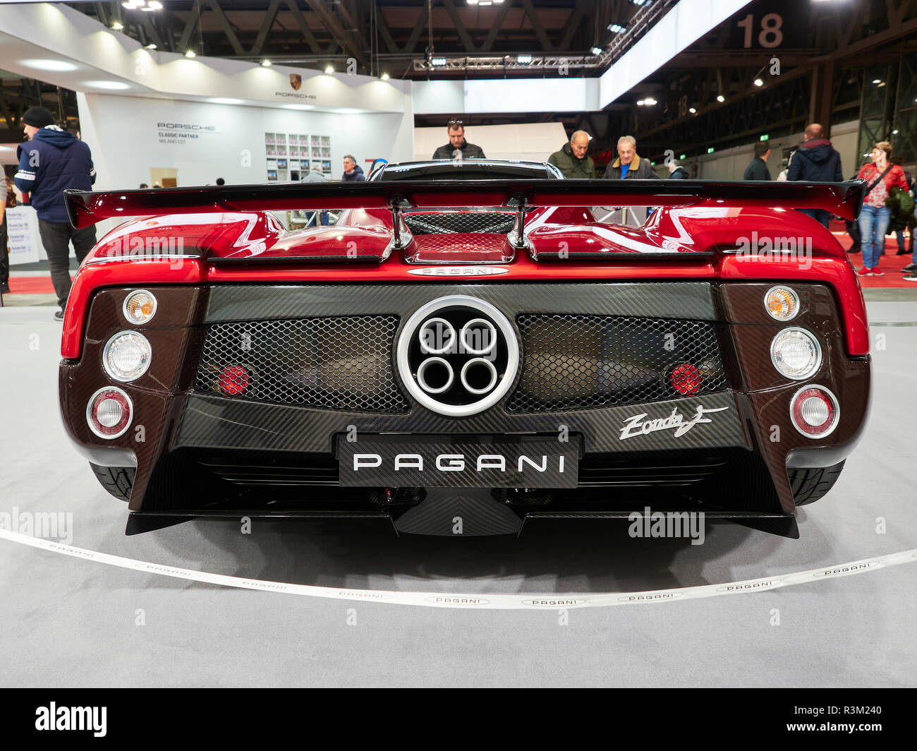 Milan, Lombardy Italy - November 23 , 2018 - Rear view of red Pagani Zonda 5 with Mercedes-Benz