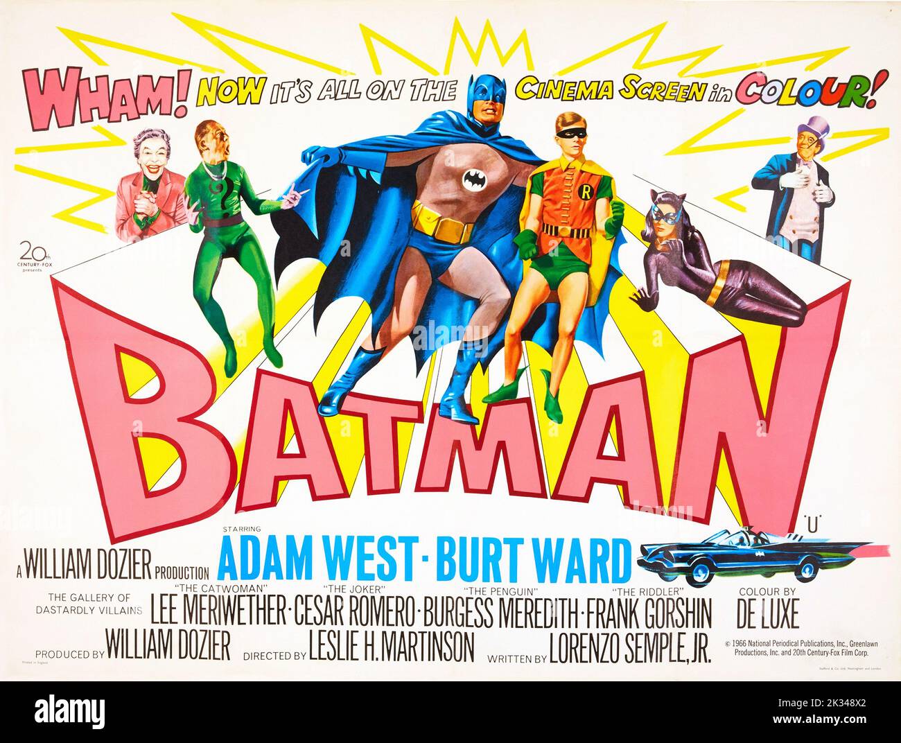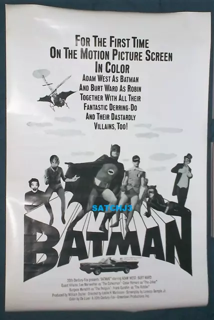 BATMAN, 1966, Original vintage Adam West ( movie theater poster starring Adam West as Batman, Burt Ward as Robin, Lee Meriwether, director Leslie Martinson writers Lorenzo Semple Jr. and Bob Kane. Bob