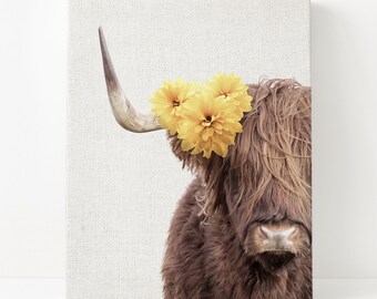 Highland Cow Wearing Yellow Flower, Farm Animal, Scottish Cow, Animal Art, Rustic Farm Decor, Unframed Animal Art Print by Amy Peterson