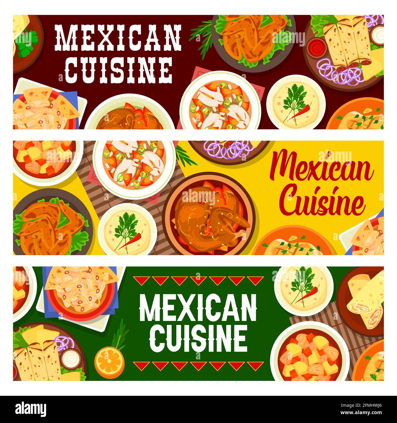 Mexican cuisine dishes, restaurant food banners. Tortilla chips and sandwich, chicken in chocolate sauce and fish soup, chili wings, de Pato tacos and Stock Vector Image & Art - Alamy