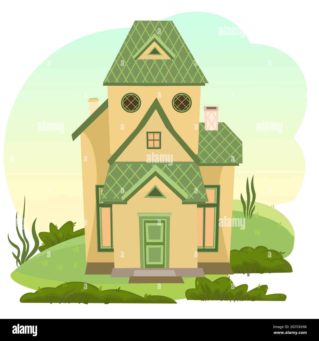 Maison de dessin animé dans la prairie. Belle vue. Confortable demeure rustique dans un style européen traditionnel. Paysage rural. Jolie maison drôle. Isolé sur blanc Photo Stock - Alamy
