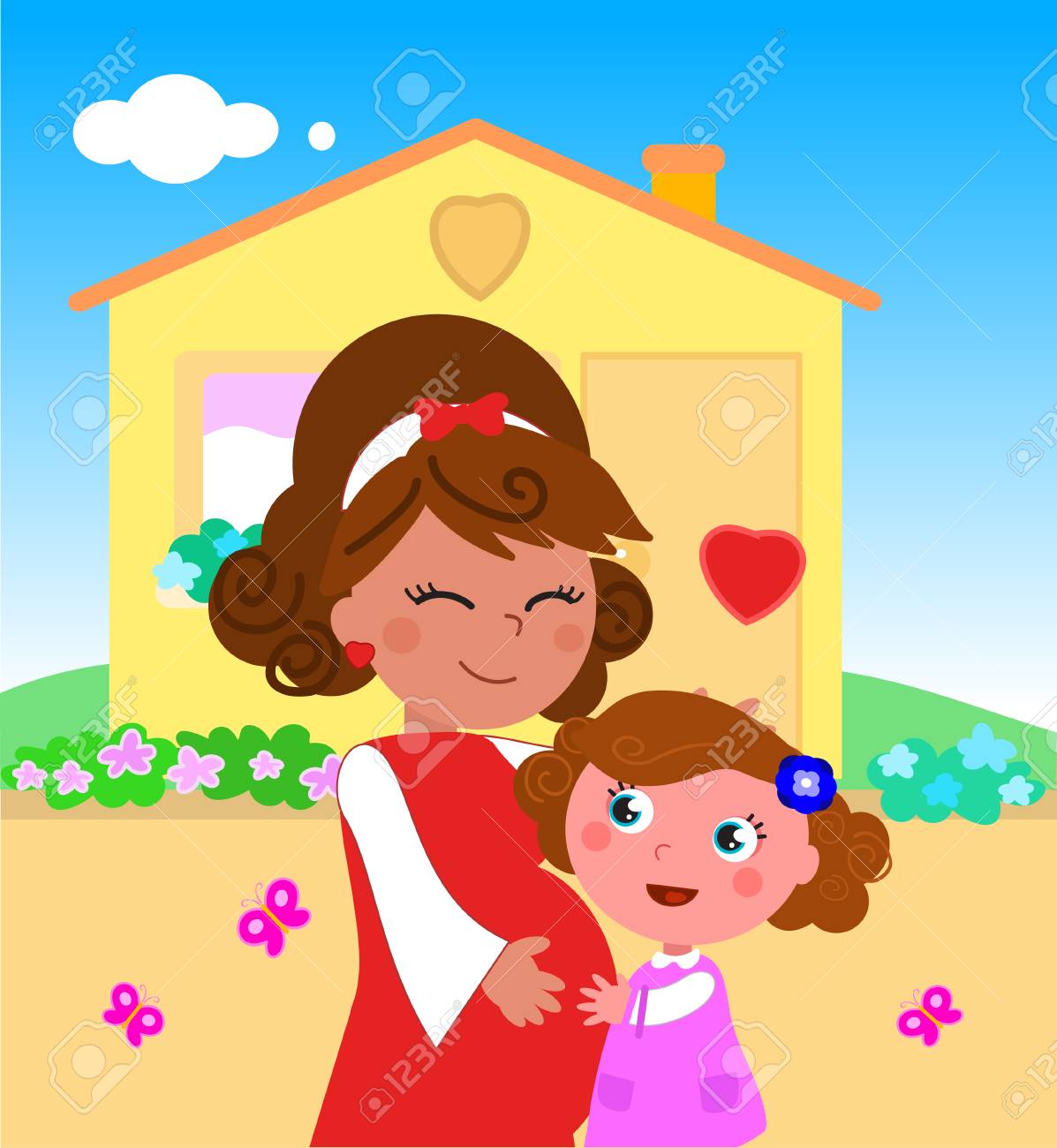 Dessin Animé Mignon Maman Enceinte Et Petite Fille, Illustration. Clip Art Libres De Droits, Svg, Vecteurs Et Illustration. Image 87884324