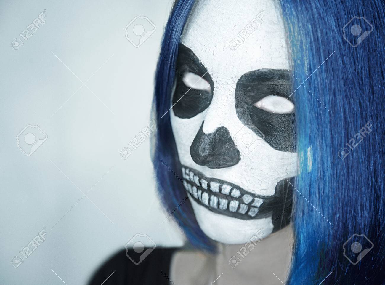 Portrait De Jeune Femme Avec Le Crâne Et Le Maquillage Des Yeux Blancs. Espace Pour Le Texte En Partie Gauche De L'image. Halloween Ou Thème D'horreur Banque D'Images et Photos Libres De