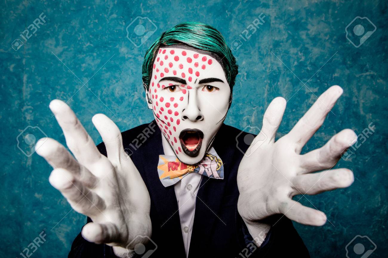 Homme Exprime Mime Plaisir Avec Les Mains. Habillé Dans Le Style Du Pop Art. Maquillage Lumineux Banque D'Images et Photos Libres De Droits. Image 45064596