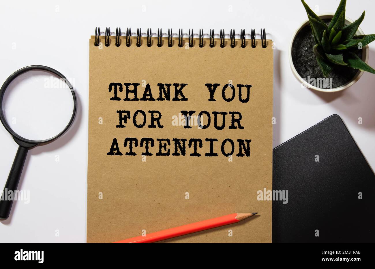Phrase Merci Pour Votre Attention écrite Sur L'étiquette Avec Stylo Et Papier Blanc Photo stock - Image du bureau, compagnie: 217386306