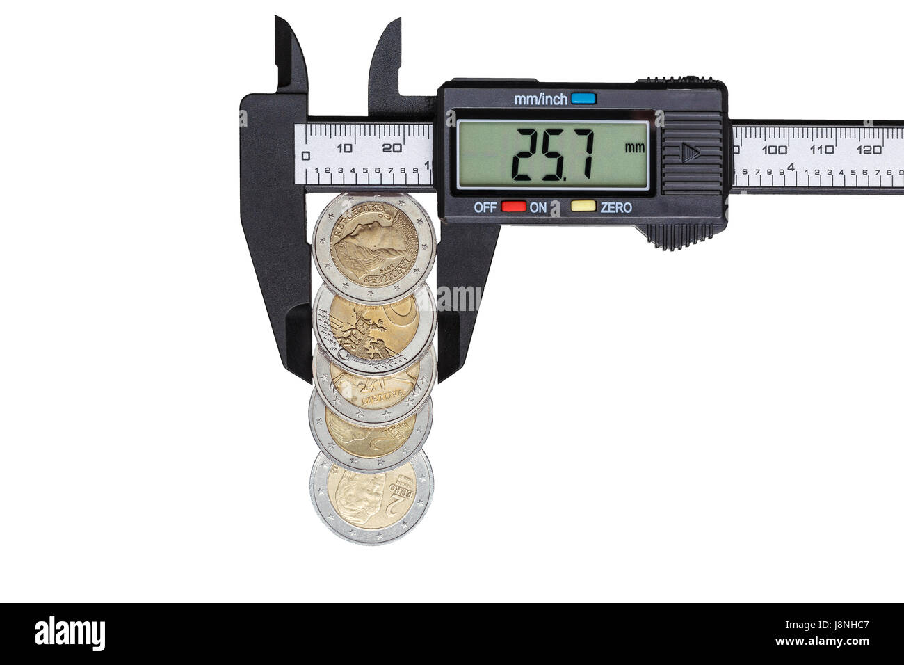 L'étrier numérique mesure le diamètre de 5 pièces d'une valeur nominale de 2 euros. Objets isolé sur fond blanc Photo Stock - Alamy