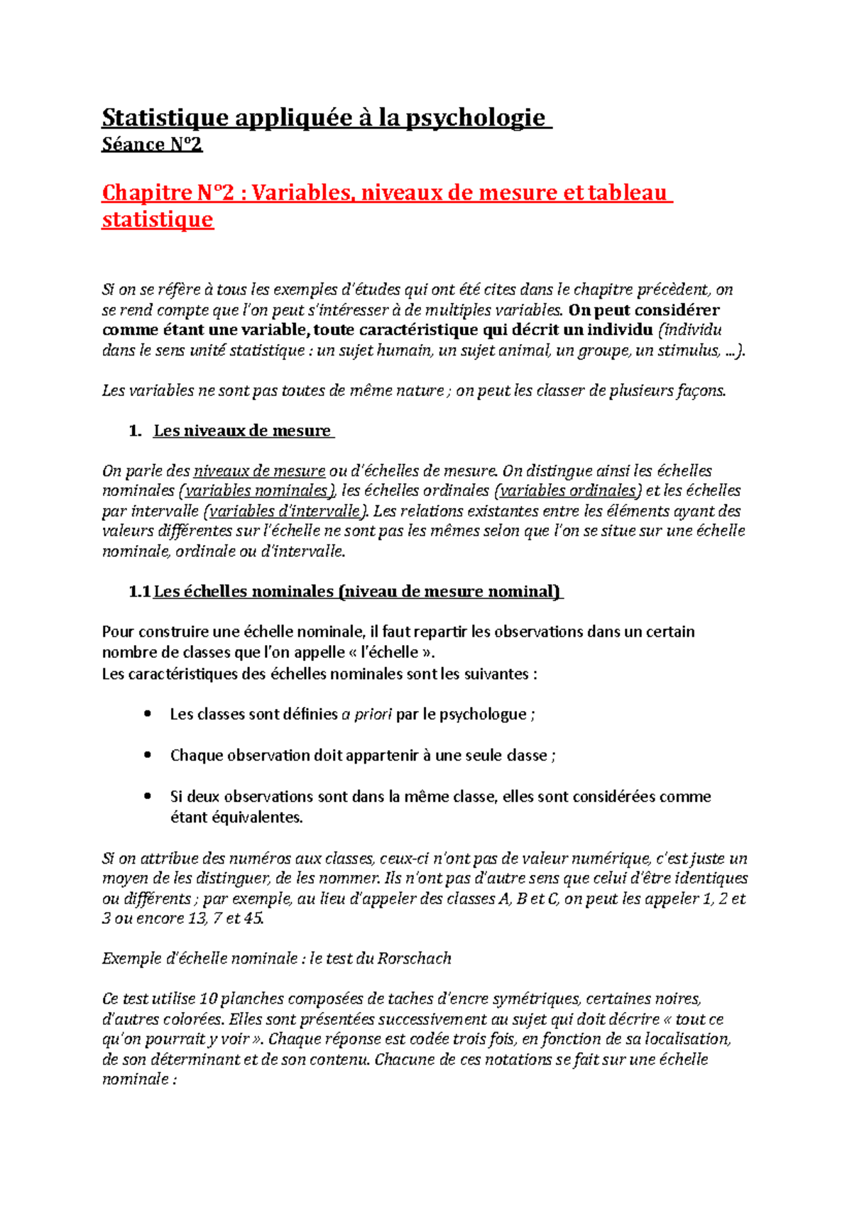 Séance N°2 - statistique appliquée a la psychologie VARIABLES, NIVEAUX DE MESURE ET TABLEAU - Studocu