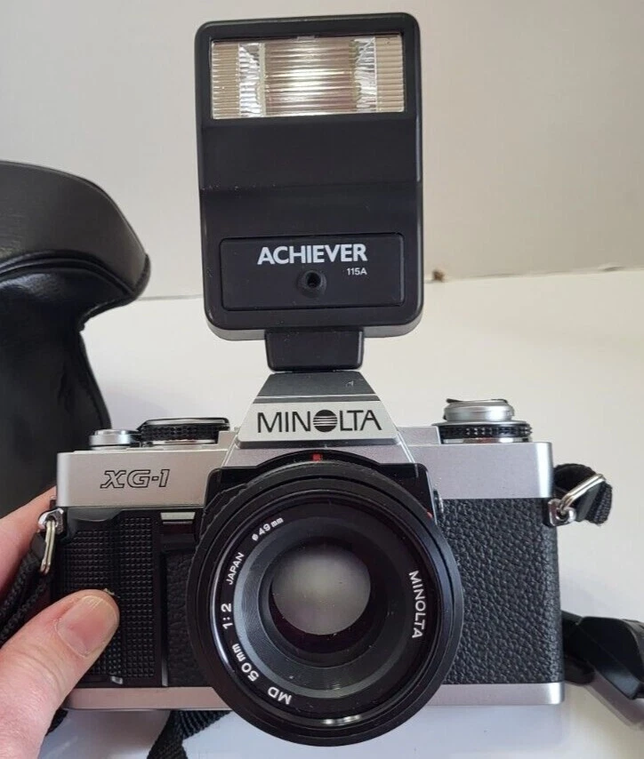 Minolta XG-1 35mm SLR Film Camera w/50mm F2 MD Lens w/Case & Flash Untested Vtg