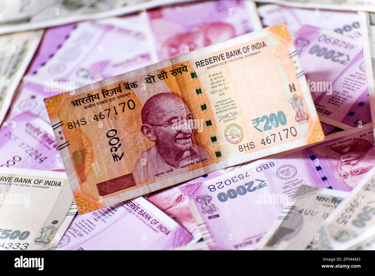 Gros plan de deux cents roupies indiennes contre la monnaie papier indienne arrière-plan Photo Stock - Alamy