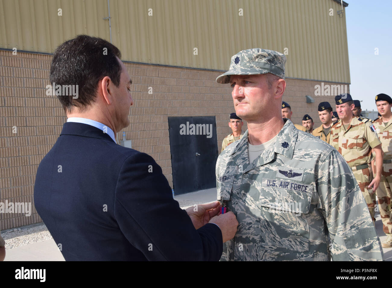 Monsieur Eric Chevallier, Ambassadeur de France au Qatar, les axes d'une médaille de bronze de la Défense nationale française sur le Lieutenant-colonel Charles Palmer, chef de la cellule de liaison de la