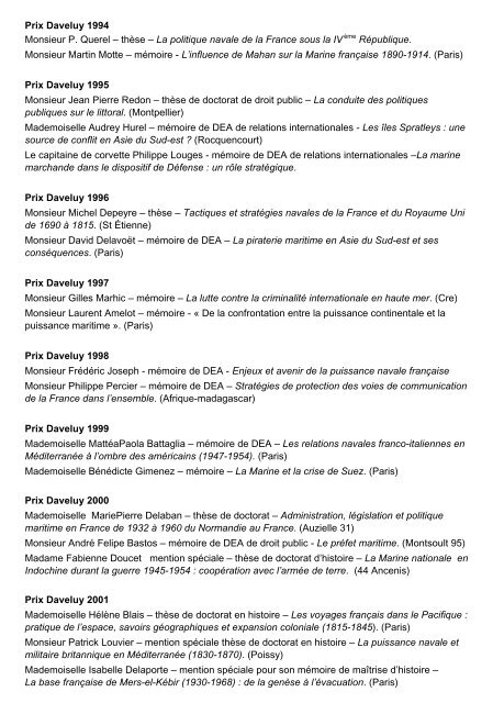 Liste des laureats du Prix Daveluy depuis 1994 - Marine et Marins