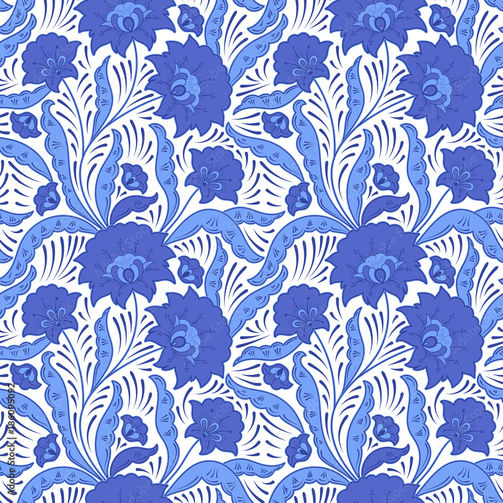 Russian floral pattern seamless vector. Traditional folk style gzhel flower blue white background. Design with chinese porcelain, delft dutch ceramic, oriental vintage motifs. Retro botanical texture. Stock Vector | Adobe Stock