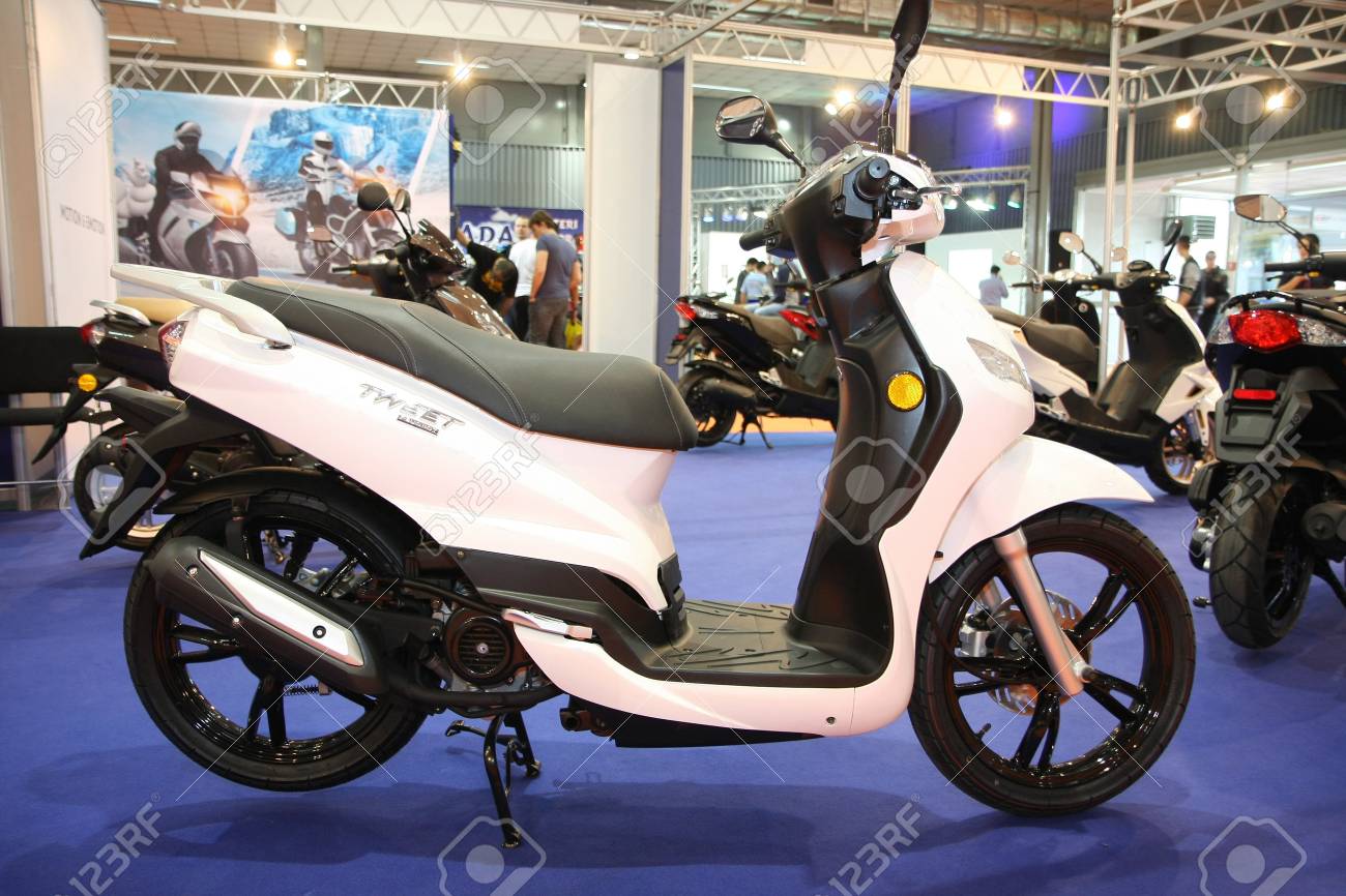 Описание: БЕЛГРАД, СЕРБИЯ-МАРТ 29,2017: Peugeot Scooter Tweet На 11-й Международной Выставке Мотоциклов Фотография, картинки, изображения и сток-фотография без роялти. Image 78724107