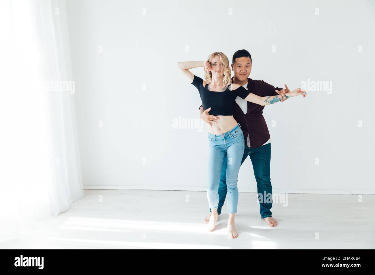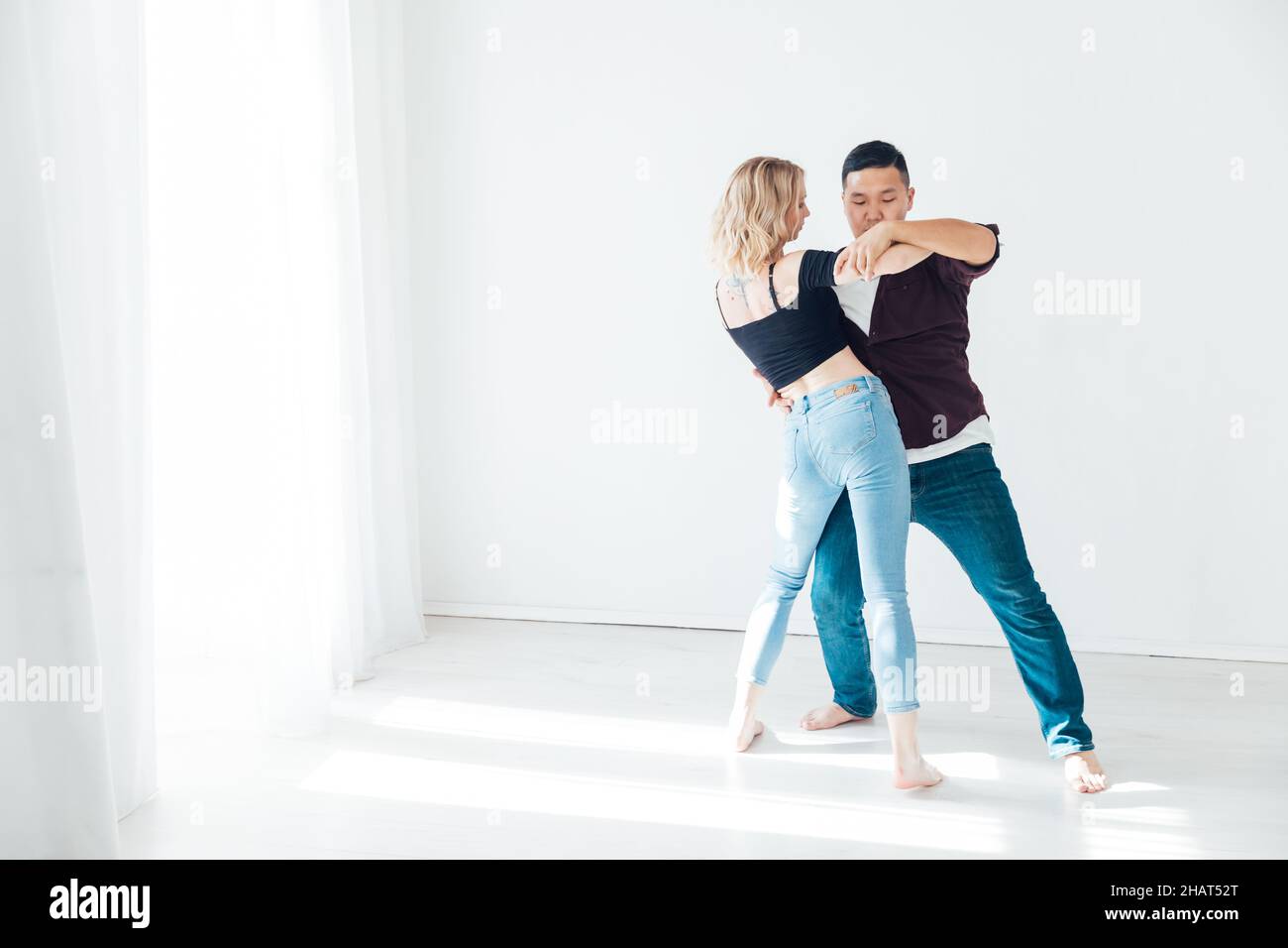 Une femme et un homme dansant à la musique d'un bachata dans une salle blanche Photo Stock - Alamy