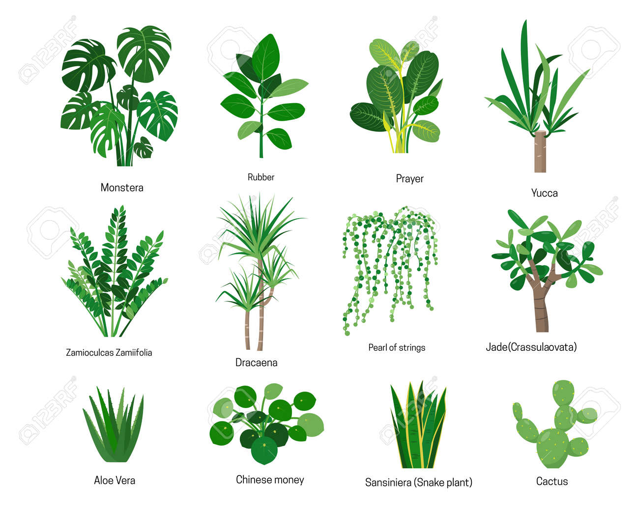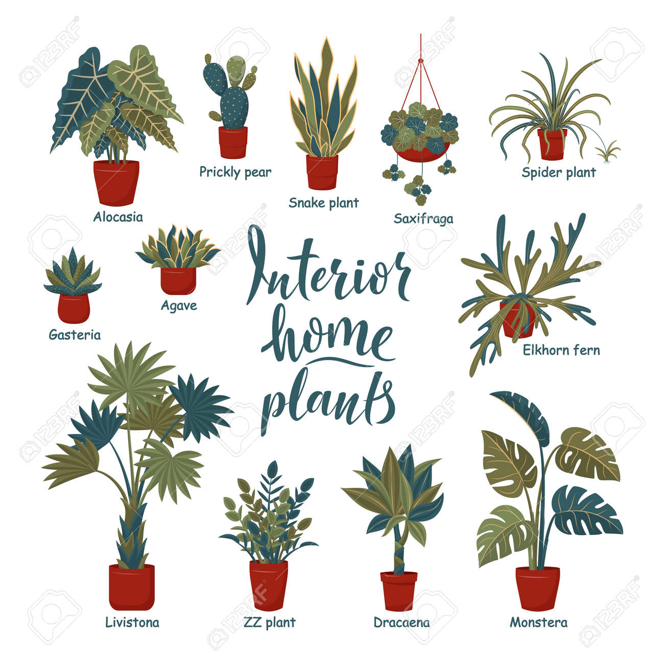 Ensemble de nombreuses plantes en pot populaires différentes avec des noms sur fond blanc Photo Stock - Alamy