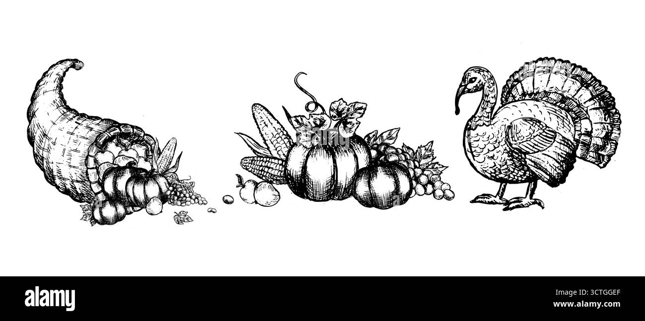 Dessin de Thanksgiving, noir et blanc, dessin au trait de la dinde ...