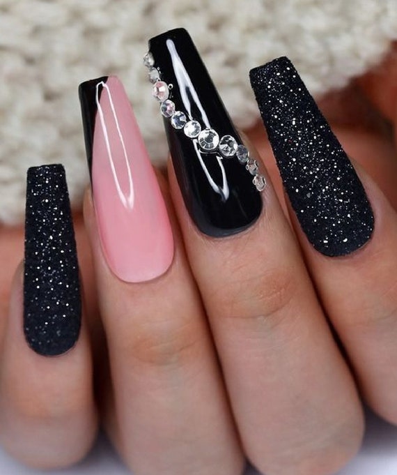 Rose noir avec strass Nail Design sur acrylique Appuyez sur les ongles Meilleure vente Fabriqué à la main Conseils de couverture complète Toutes les tailles Forme et longueurs - Etsy France