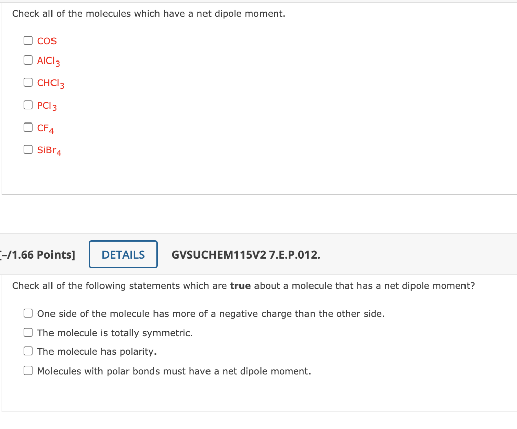 Solved Check all of the molecules which have a net dipole | Chegg.com