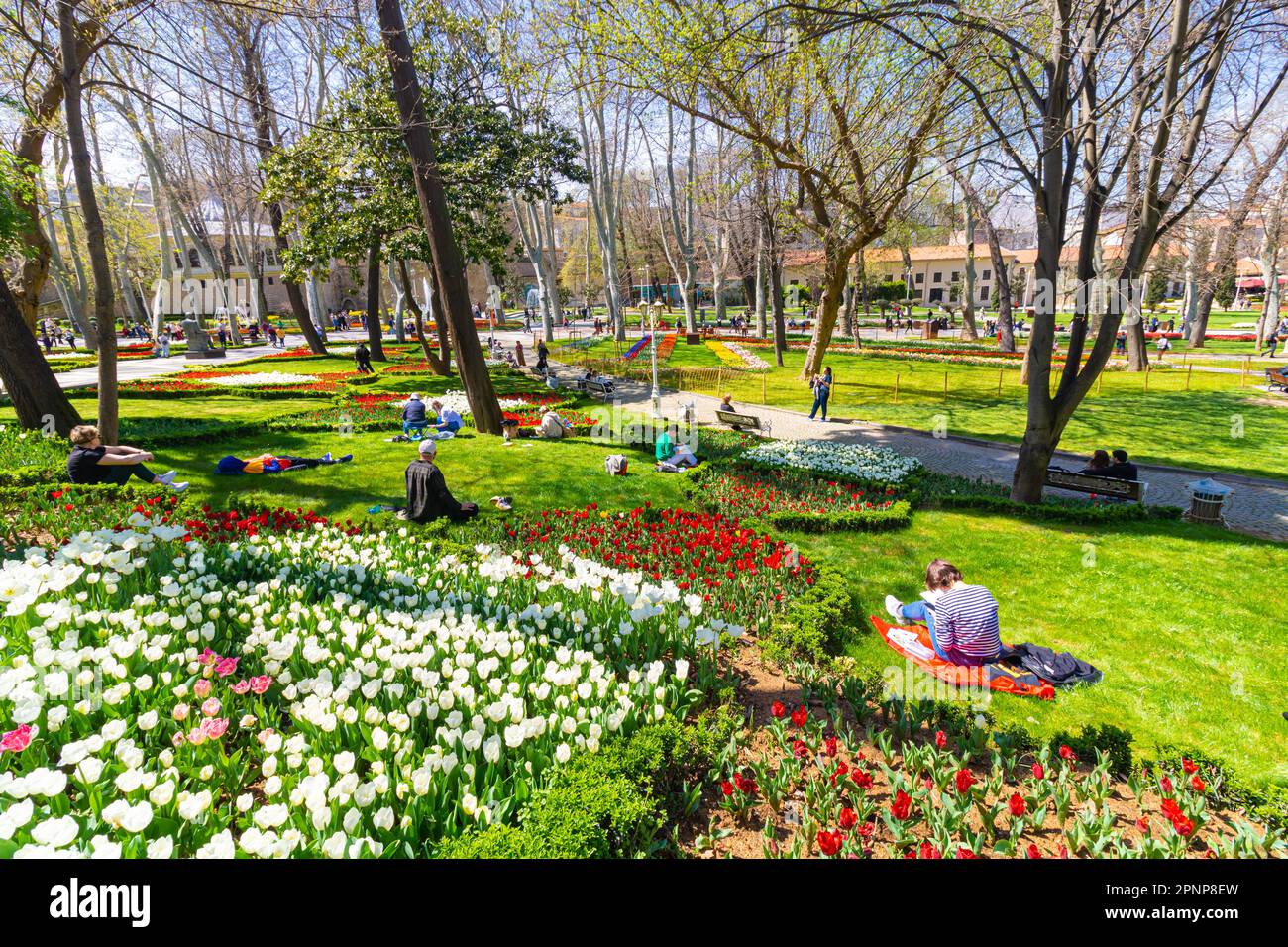 People in the Gulhane Park in springtime. Public parks in Istanbul ...