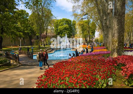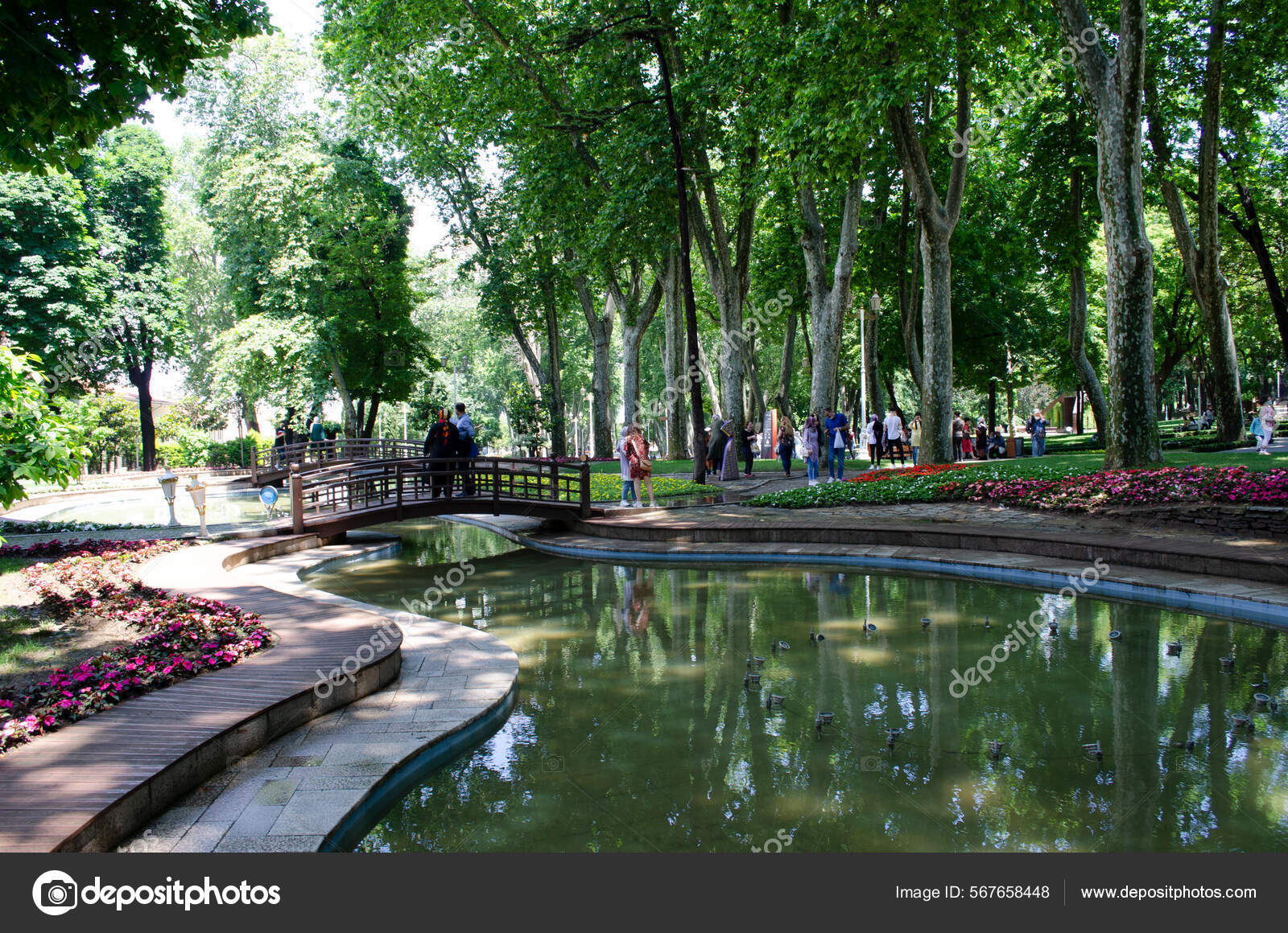 Tourists around the pond in Gulhane Park in Istanbul in Spring ...