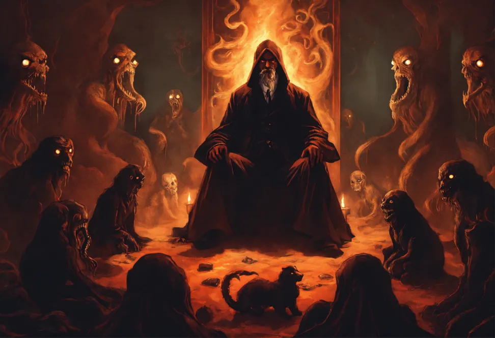 Lexica - clashing against divine deities surrounded by divine halos. the scene conveys a sense of melancholy and the haunting depths of the asura prince's existence