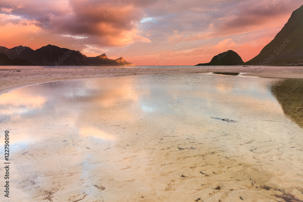 Magnifique paysage de Norvège: coucher de soleil sur la plage à ...