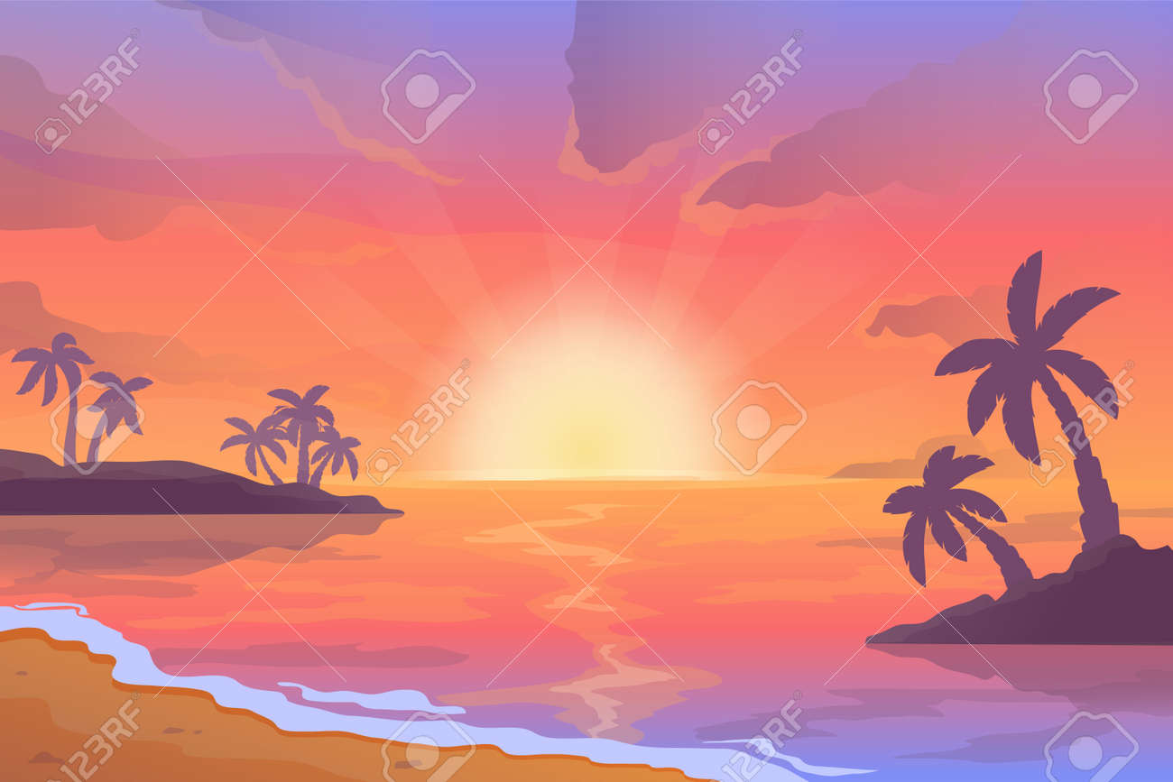 Paysage De Plage Au Coucher Du Soleil. Scène De Dessin Animé Avec ...