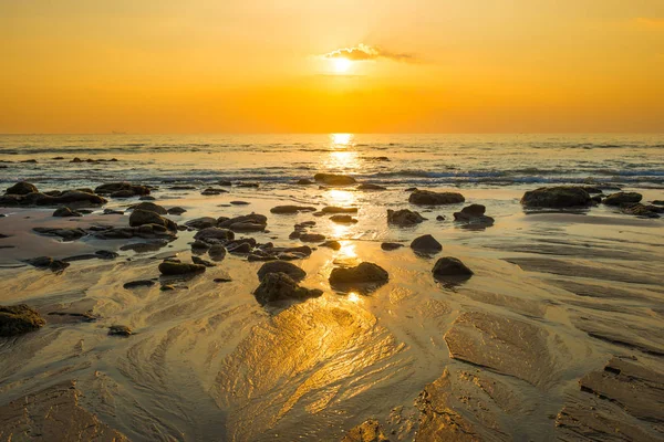 Paysage au coucher du soleil avec plage, soleil et pierres au bord ...