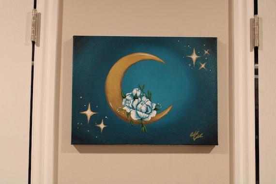 Fleurs de lune Peinture originale, Croissant de lune bleu et or ...