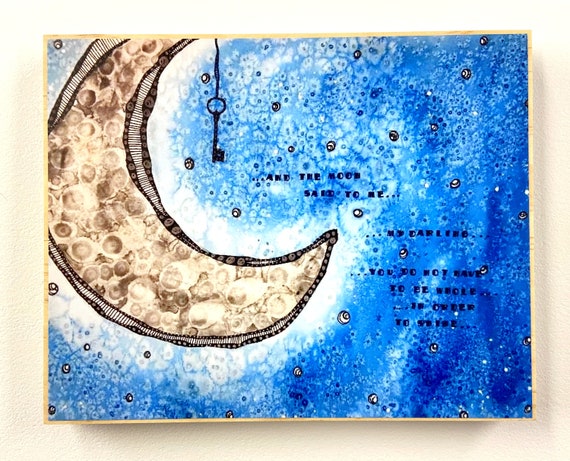 Peinture de lune - Art de la lune - Plaque de lune - Décor de l’espace - Décor de la lune - Art du croissant de lune - Œuvre d’art fantaisiste - Lune ...