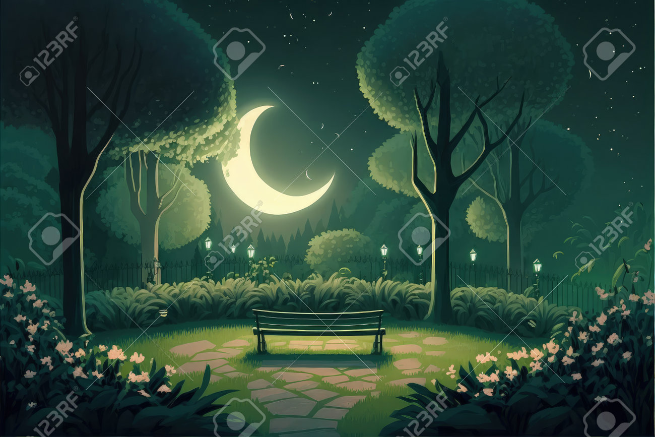 Beau Paysage De Jardin La Nuit Avec Grand Croissant De Lune, Style ...