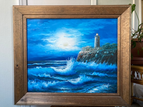IMPRESSION D'ART SUR TOILE Phare vintage la nuit Peinture à lhuile ...