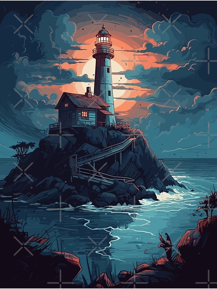 Peinture D'un Phare La Nuit Avec La Pleine Lune Dans Le Ciel Ai ...