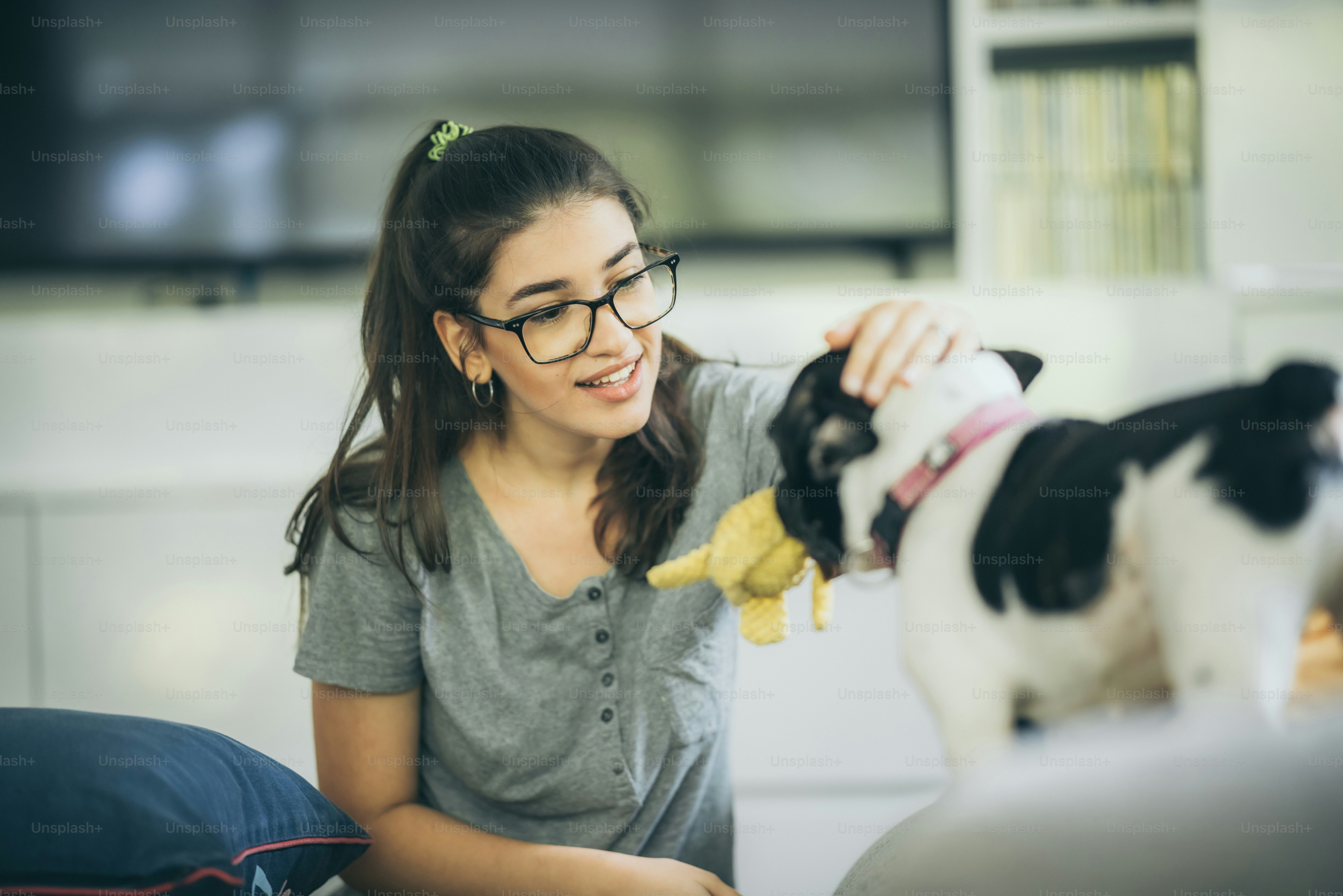 Jeune fille jouant un chien à la maison, femme mignonne personne avec son animal de compagnie