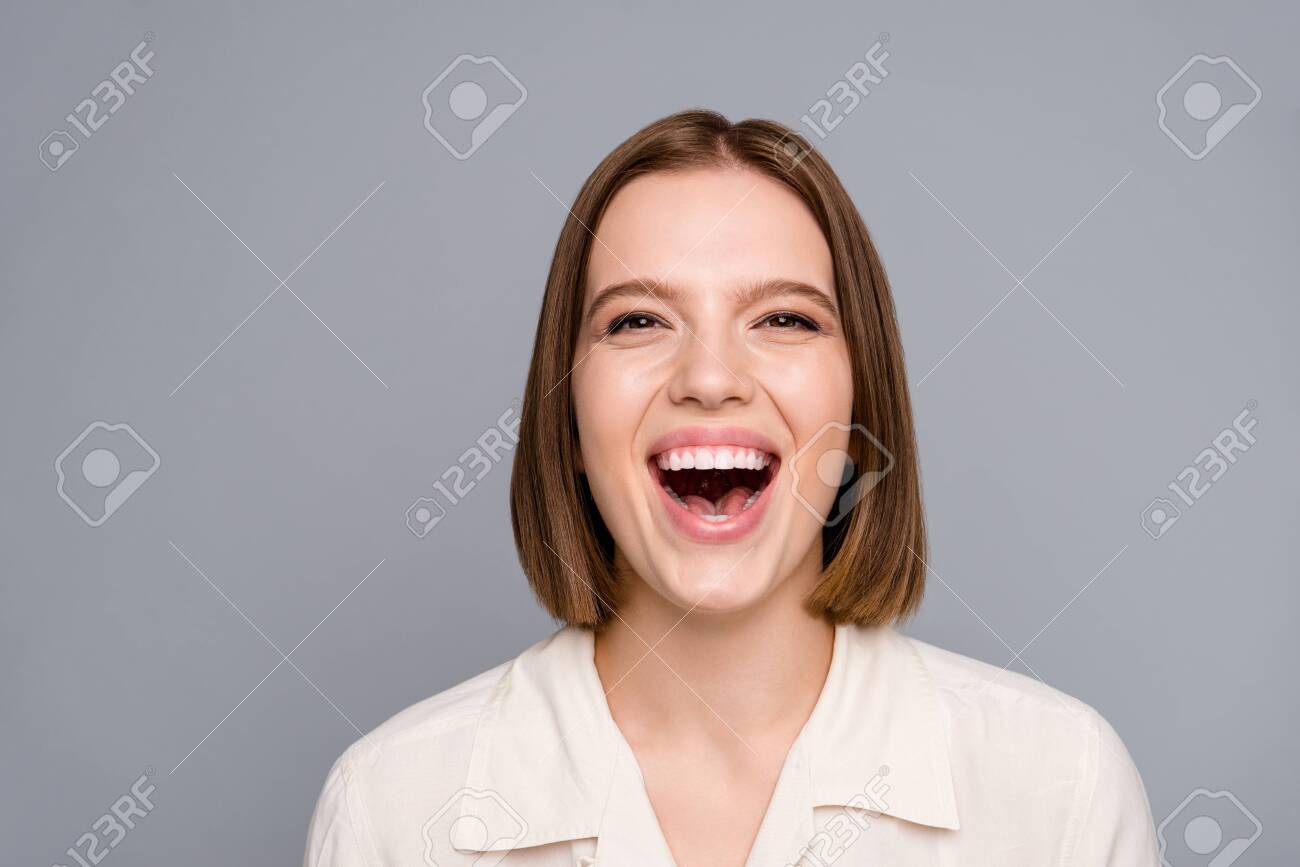 La Photo En Gros Plan D'une Charmante Personne Mignonne De Personnes Du Millénaire A Du Temps Libre Isolé Insouciant Vêtu De Vêtements À La Mode Chemisier Isolé Gris Argent Fond Banque D'Images